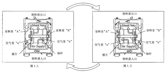 軸桿上固定有兩個(gè)膜片,每端一個(gè)。當(dāng)壓縮空氣供至空氣室b(右側(cè),見圖1.1)時(shí),軸桿向右移動,容料室B中的物料被擠出,同時(shí)被吸進(jìn)容料室A中。